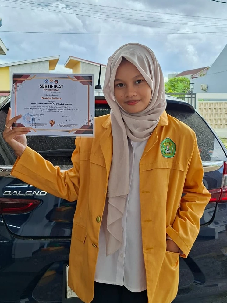 Mahasiswa Jurusan Pendidikan Bahasa dan Seni, Program Studi Pendidikan Bahasa dan Sastra Indonesia (PBSI) angkatan 2025 Universitas Mulawarman kembali menorehkan prestasi membanggakan di tingkat nasional. Naida Felicia berhasil meraih Juara 1 cabang lomba Penulisan Puisi dalam ajang Pekan Ilmiah, Seni, dan Budaya Nasional (PISBN) 2025 yang diselenggarakan oleh Fakultas Ilmu Budaya Universitas Halu Oleo.