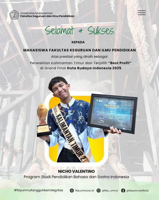 Program Studi Pendidikan Bahasa dan Sastra Indonesia (PBSI) dengan bangga mengapresiasi prestasi salah satu mahasiswanya, NICHO VALENTINO, mahasiswa PBSI angkatan 2025, yang berhasil mengharumkan nama Kalimantan Timur dalam Ajang Duta Budaya Indonesia 2025. Ajang ini merupakan kompetisi nasional bergengsi yang memilih pemuda-pemudi berusia 17–30 tahun untuk menjadi agen pelestarian budaya sekaligus representasi generasi muda yang berkomitmen menjaga warisan budaya bangsa.