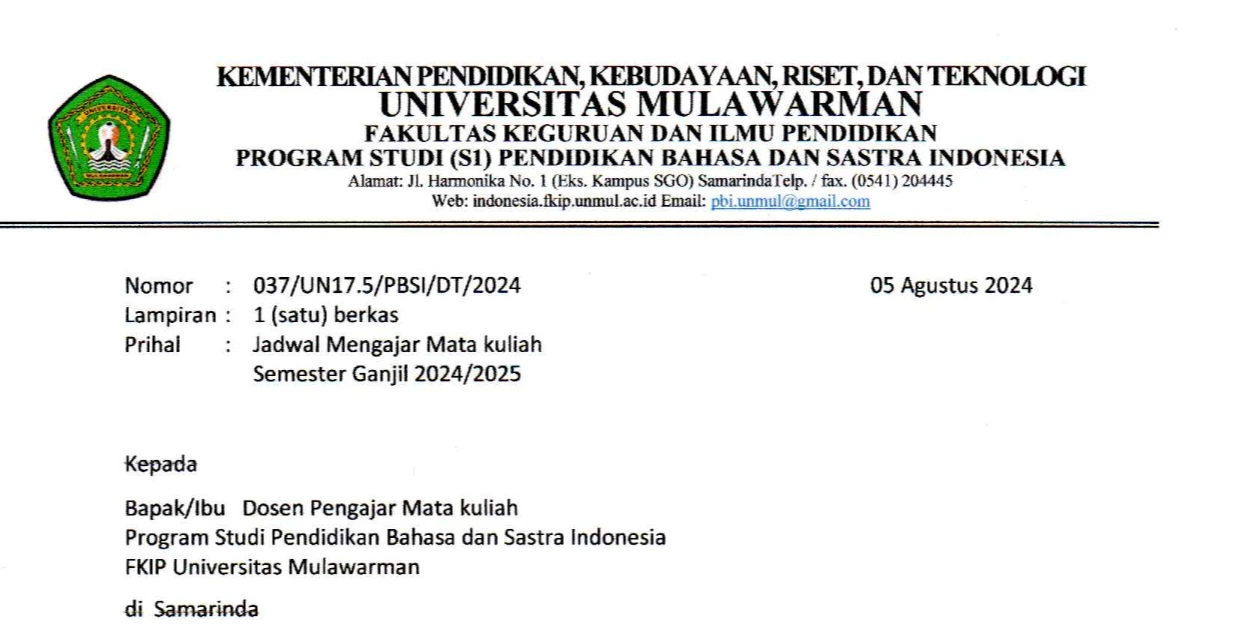 Berikut adalah Jadwal Perkuliahan Jurusan Pendidikan Bahasa dan Sastra Indonesia Periode Semester Ganjil Tahun Akademik 2024/2025
